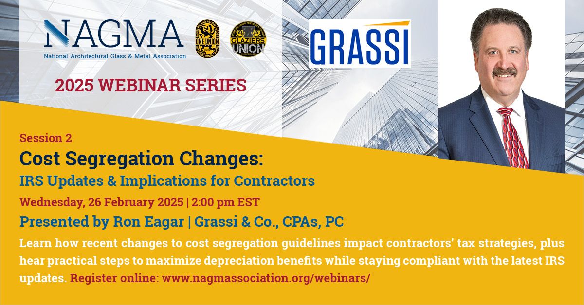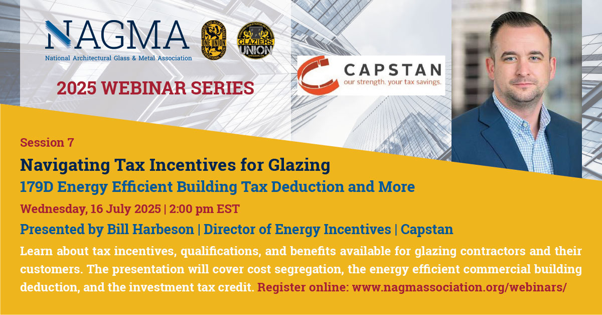 Learn about tax incentives, qualifications, and benefits available for glazing contractors and their customers. The presentation will cover cost segregation, the energy efficient commercial building deduction, and the investment tax credit.